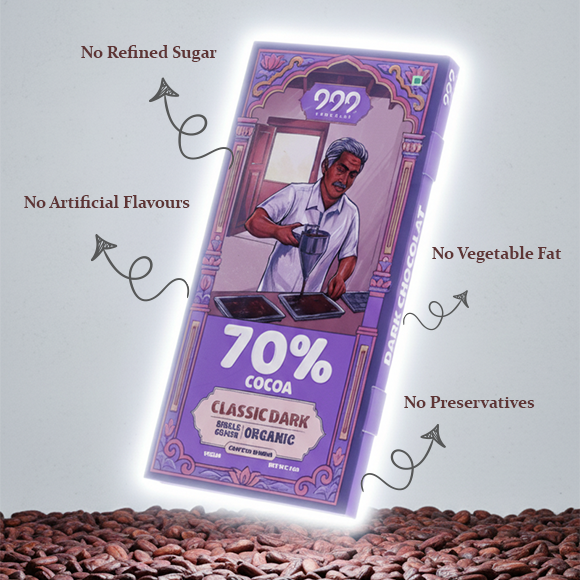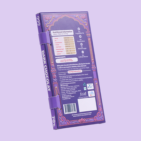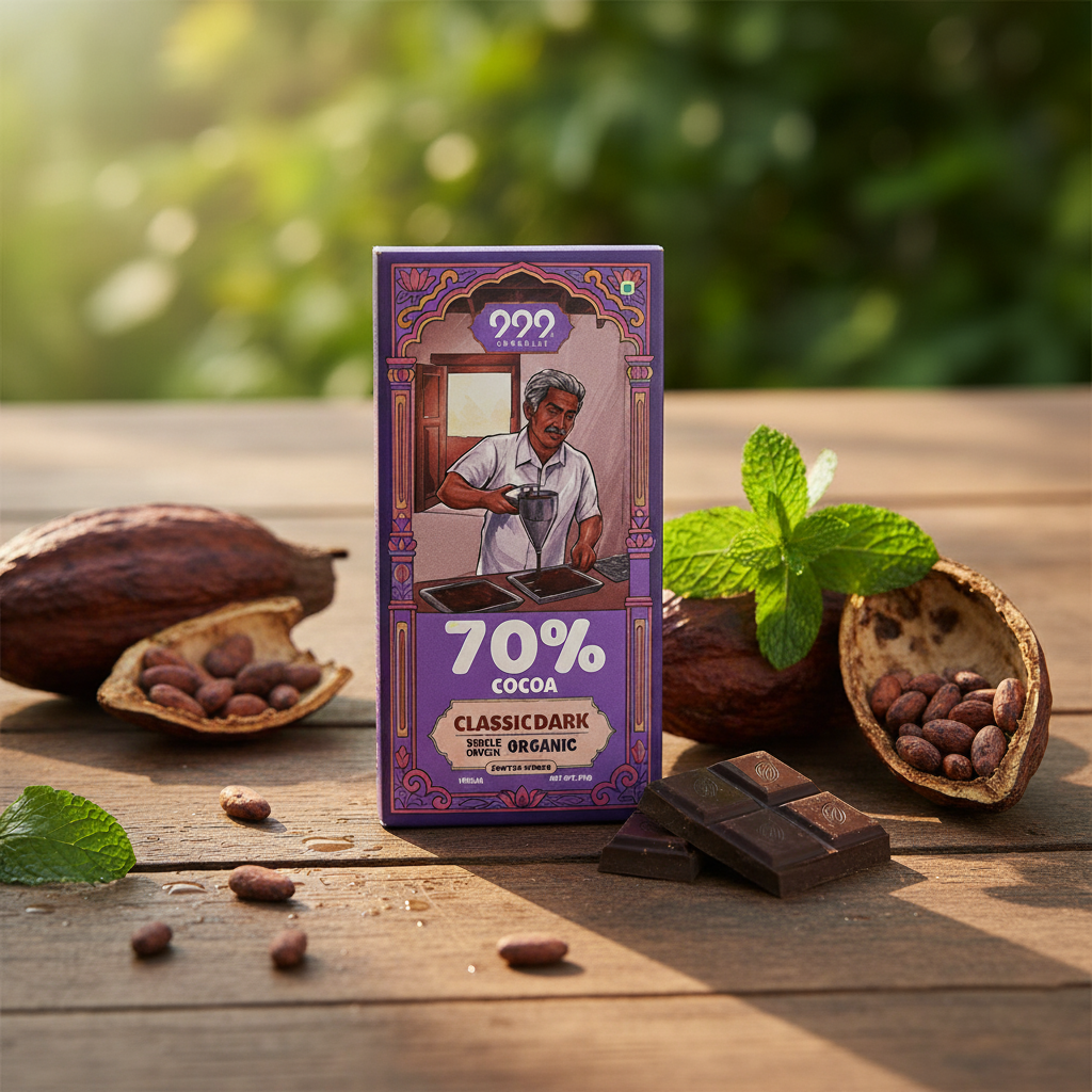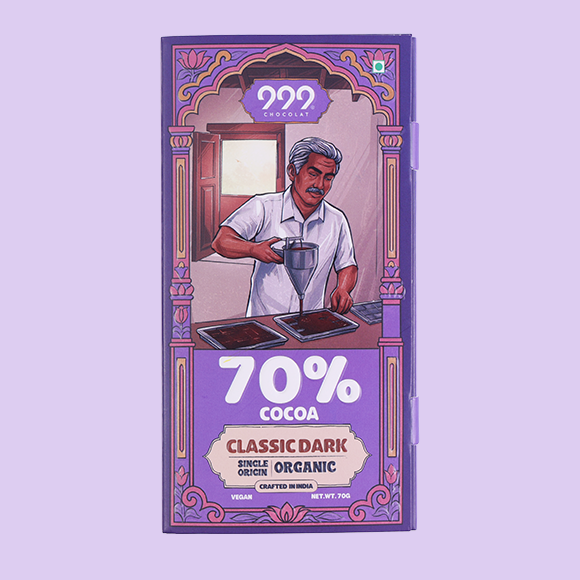 Elegant Indian-inspired artwork, the pack mirrors tradition blended with modern chocolate-making Smooth and well-rounded, our 70% Classic Dark chocolate offers the perfect harmony of cocoa richness and gentle sweetness. Every bite carries notes of roasted cacao with a velvety melt, making it indulgent yet approachable – the true gateway into the world of fine dark chocolate.